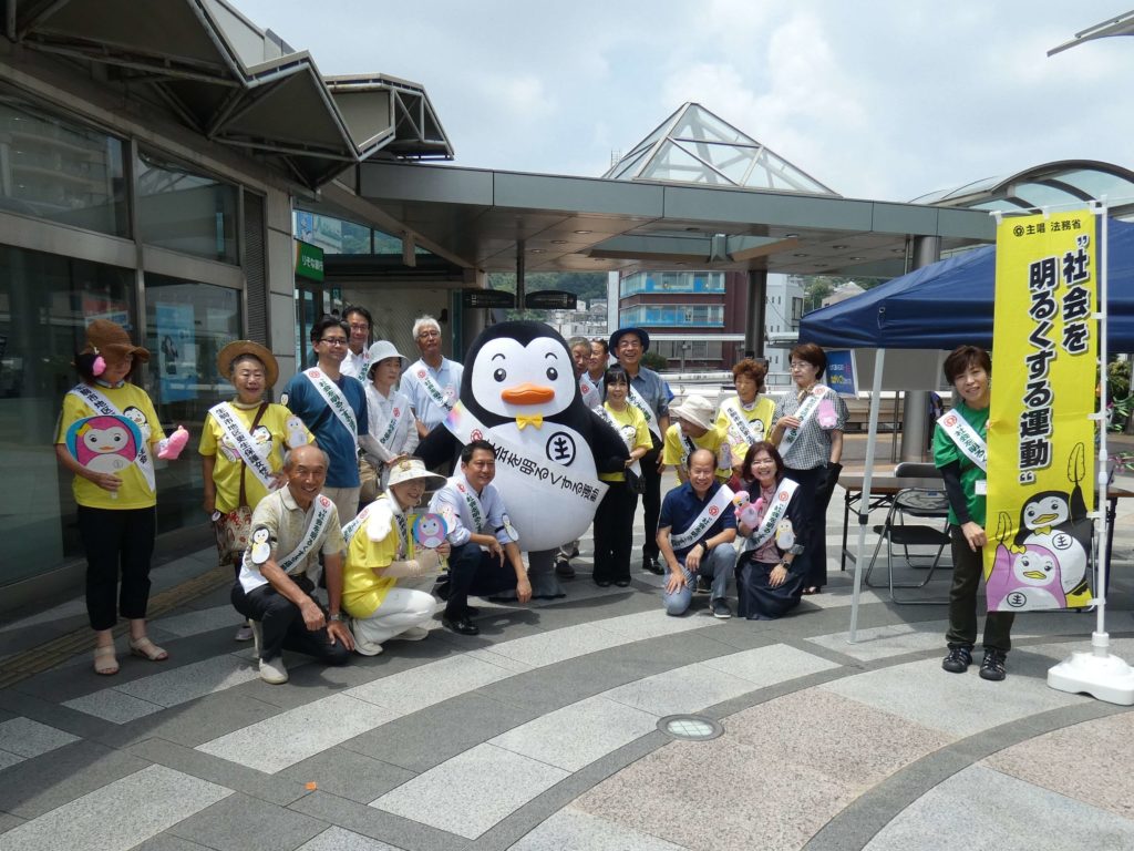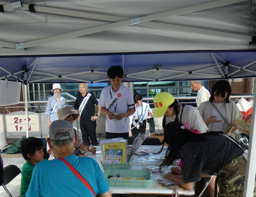 総理大臣メッセージ伝達式の後、生駒市社会を明るくする運動推進委員会委員長の小紫市長を筆頭に生駒市各種団体の皆さんと合同でPRグッズの配布、短冊に願い事を書いていただくイベント、更生保護キャラクターのホゴちゃんの顔出しパネルでの記念撮影を行いました。